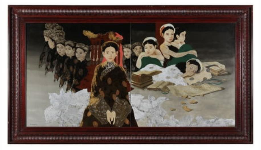 • Chất liệu: Sơn mài trên gỗ, kích thước 122 x 122 cm