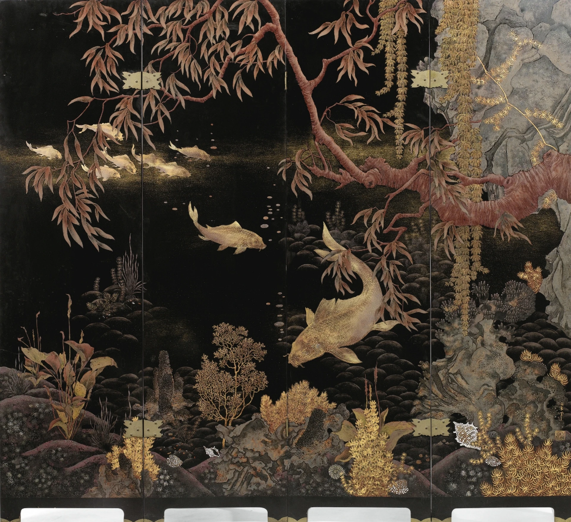 Họa sĩ Phạm Hậu, tác phẩm “Nine Carps in the Water, Chín con cá chép dưới nước” sáng tác khoảng 1939-1940. Sơn mài trên bảng gỗ, kích thước tổng thể: 180 x 198 cm.